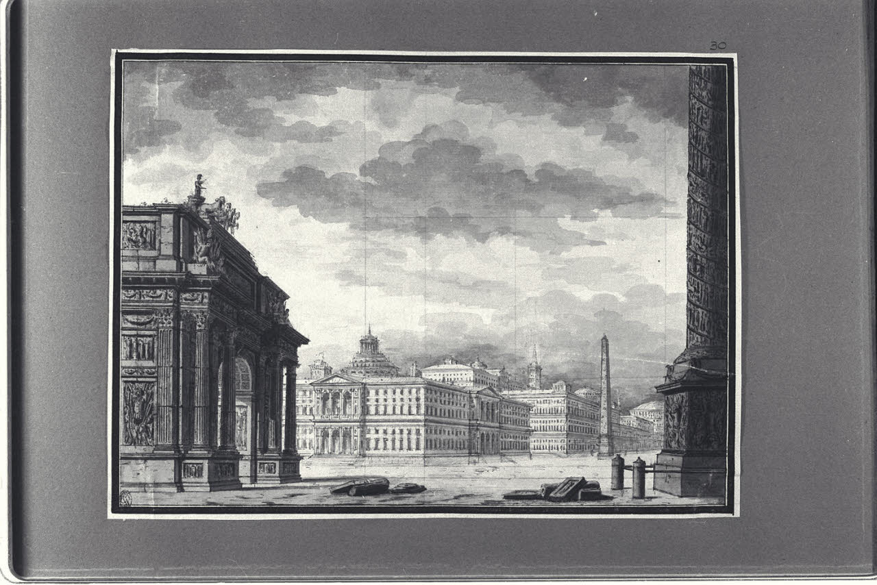 Veduta cittadina con arco trionfale, colonna istoriata e obelisco
