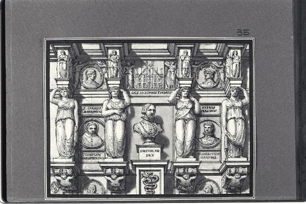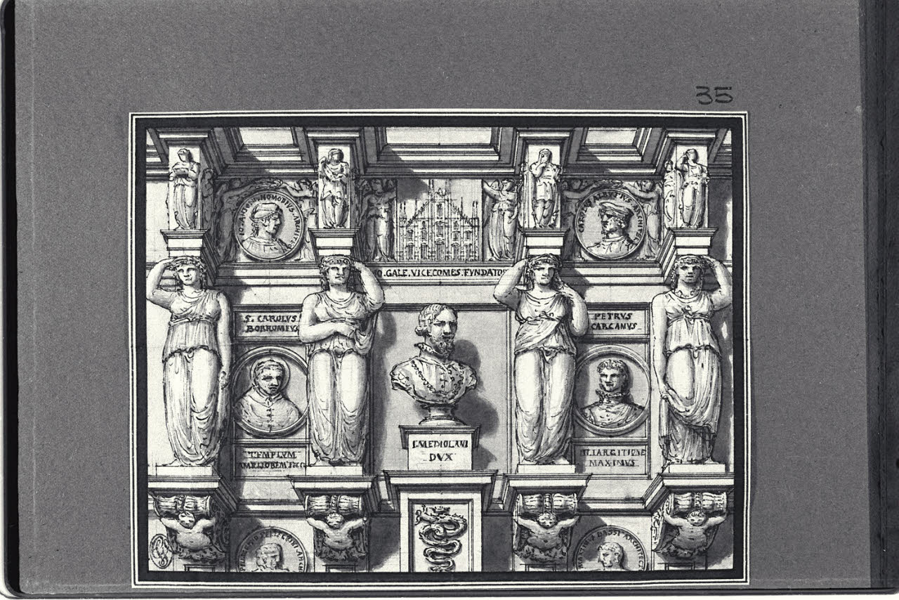 - NOTIZIE STORICO CRITICHE Il disegno fa parte di un album Vallardi del 1840, di dimensioni mm 352 x 460, sulla cui copertina in pelle marrone chiaro è incisa l'iscrizione in lettere capitali dorate "Paolo Landriani / milanese / e suoi contemporanei / nell'arte prospettica valentissimi / questi loro disegni / Giuseppe Vallardi / raccolse / per tramandare / co' passati maestri a' futuri / la stabile rinomanza / della scuola lombarda / l'anno MDCCCXL". Ogni singolo disegno è incollato a un foglio dell'album di carta di colore grigio-azzurro.\nL'opera presenta analogie con altre dello stesso album Vallardi D 13, attribuite a Landriani, soprattutto nelle fattezze dei visi delle cariatidi e dei busti. Nel disegno sono visibili le effigi, clipeate o a mezzobusto, dello scultore e architetto Giovanni Antonio Amodeo, l'architetto Carlo Albuzzi, san Carlo Borromeo, Gian Galeazzo Visconti, Giovan Pietro Carcano, gli architetti Pellegrino Tibaldi e Martino Bassi.