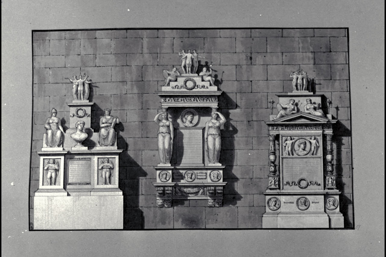 - NOTIZIE STORICO CRITICHE Il disegno fa parte di un album Vallardi del 1840, di dimensioni mm 561 x 735, sulla cui copertina in pelle marrone è incisa l'iscrizione in lettere capitali dorate "Paolo Landriani / milanese / e suoi contemporanei / nell'arte prospettica valentissimi. / Questi loro disegni / Giuseppe Vallardi / raccolse / per tramandare / co' passati maestri a' futuri / la stabile rinomanza / della scuola lombarda / l'anno MDCCCXL.". Ogni singolo disegno è incollato a un foglio dell'album, di carta grigia, presentante una cornice realizzata a penna e pennello e inchiostro sui toni del grigio.\nL'opera mostra similitudini iconografiche con altre, di analogo soggetto, conservate negli album Vallardi. Nei monumenti sono visibili i ritratti clipeati di artisti come, per esempio, Leonardo da Vinci, Correggio e Giuliano Traballesi.