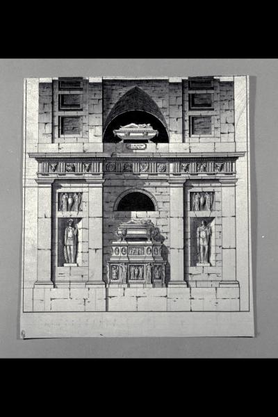 - NOTIZIE STORICO CRITICHE Il disegno fa parte di un album Vallardi del 1840, di dimensioni mm 561 x 735, sulla cui copertina in pelle marrone è incisa l'iscrizione in lettere capitali dorate "Paolo Landriani / milanese / e suoi contemporanei / nell'arte prospettica valentissimi. / Questi loro disegni / Giuseppe Vallardi / raccolse / per tramandare / co' passati maestri a' futuri / la stabile rinomanza / della scuola lombarda / l'anno MDCCCXL.". Ogni singolo disegno è incollato a un foglio dell'album, di carta grigia, presentante una cornice realizzata a penna e pennello e inchiostro sui toni del grigio.\nL'opera presenta analogie stilistiche con altre, attribuite a Paolo Landriani, conservate negli album Vallardi.