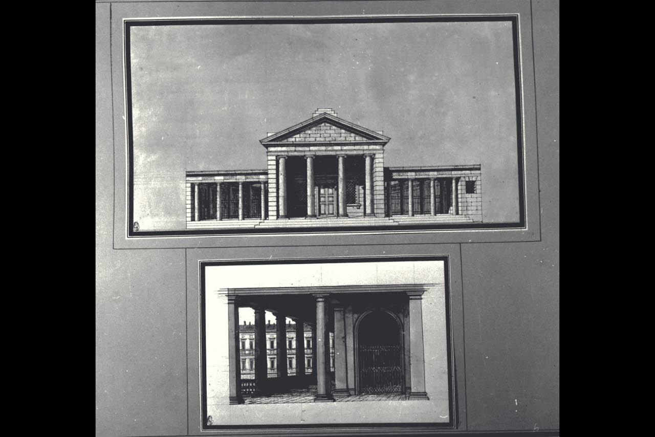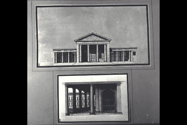 - NOTIZIE STORICO CRITICHE Il disegno fa parte di un album Vallardi del 1840, di dimensioni mm 561 x 735, sulla cui copertina in pelle marrone è incisa l'iscrizione in lettere capitali dorate "Paolo Landriani / milanese / e suoi contemporanei / nell'arte prospettica valentissimi. / Questi loro disegni / Giuseppe Vallardi / raccolse / per tramandare / co' passati maestri a' futuri / la stabile rinomanza / della scuola lombarda / l'anno MDCCCXL.". Ogni singolo disegno è incollato a un foglio dell'album, di carta grigia, presentante una cornice realizzata a penna e pennello e inchiostro sui toni del grigio.\nL'opera mostra analogie iconografiche con un altro studio per il cimitero di Porta Tosa conservato nello stesso album Vallardi D 14.