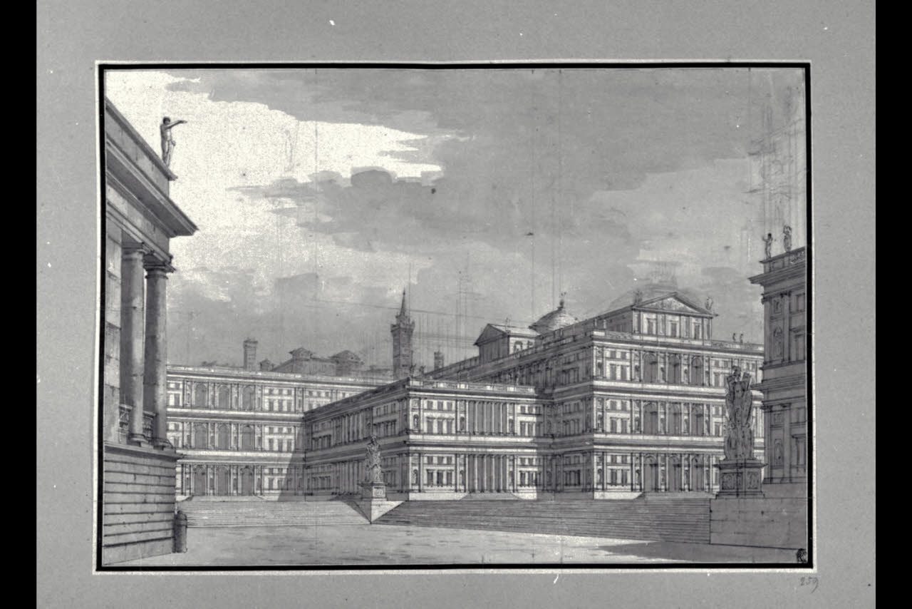 - NOTIZIE STORICO CRITICHE Il disegno fa parte di un album Vallardi del 1840, di dimensioni mm 561 x 735, sulla cui copertina in pelle marrone è incisa l'iscrizione in lettere capitali dorate "Paolo Landriani / milanese / e suoi contemporanei / nell'arte prospettica valentissimi. / Questi loro disegni / Giuseppe Vallardi / raccolse / per tramandare / co' passati maestri a' futuri / la stabile rinomanza / della scuola lombarda / l'anno MDCCCXL.". Ogni singolo disegno è incollato a un foglio dell'album, di carta grigia, presentante una cornice realizzata a penna e pennello e inchiostro sui toni del grigio.\nL'opera presenta analogie, soprattutto stilistiche, con scenografie e vedute di Paolo Landriani, conservate negli album Vallardi.