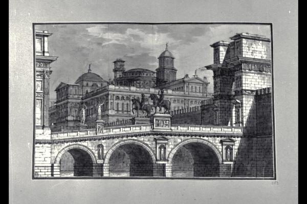 - NOTIZIE STORICO CRITICHE Il disegno fa parte di un album Vallardi del 1840, di dimensioni mm 561 x 735, sulla cui copertina in pelle marrone è incisa l'iscrizione in lettere capitali dorate "Paolo Landriani / milanese / e suoi contemporanei / nell'arte prospettica valentissimi. / Questi loro disegni / Giuseppe Vallardi / raccolse / per tramandare / co' passati maestri a' futuri / la stabile rinomanza / della scuola lombarda / l'anno MDCCCXL.". Ogni singolo disegno è incollato a un foglio dell'album, di carta grigia, presentante una cornice realizzata a penna e pennello e inchiostro sui toni del grigio.\nL'opera presenta analogie, soprattutto stilistiche, con scenografie e vedute di Paolo Landriani, conservate negli album Vallardi.