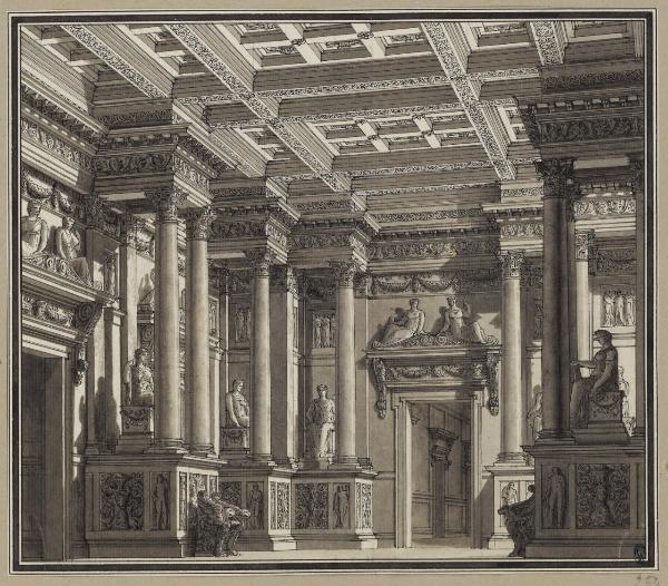 - NOTIZIE STORICO CRITICHE Il disegno fa parte di un album Vallardi del 1840, di dimensioni mm 561 x 735, sulla cui copertina in pelle marrone è incisa l'iscrizione in lettere capitali dorate "Paolo Landriani / milanese / e suoi contemporanei / nell'arte prospettica valentissimi. / Questi loro disegni / Giuseppe Vallardi / raccolse / per tramandare / co' passati maestri a' futuri / la stabile rinomanza / della scuola lombarda / l'anno MDCCCXL.". Ogni singolo disegno è incollato a un foglio dell'album, di carta grigia, presentante una cornice realizzata a penna e pennello e inchiostro sui toni del grigio.\nProbabilmente si tratta di un bozzetto teatrale.