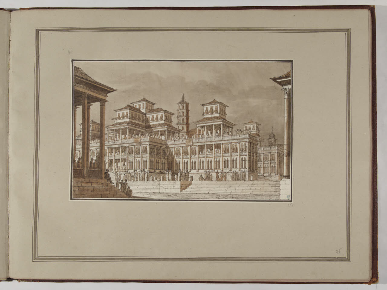 - NOTIZIE STORICO CRITICHE Il disegno fa parte di un album Vallardi del 1840, di dimensioni mm 561 x 735, sulla cui copertina in pelle marrone è incisa l'iscrizione in lettere capitali dorate "Paolo Landriani / milanese / e suoi contemporanei / nell'arte prospettica valentissimi. / Questi loro disegni / Giuseppe Vallardi / raccolse / per tramandare / co' passati maestri a' futuri / la stabile rinomanza / della scuola lombarda / l'anno MDCCCXL.". Ogni singolo disegno è incollato a un foglio dell'album, di carta grigia, presentante una cornice realizzata a penna e pennello e inchiostro sui toni del grigio.\nL'opera, nella quale è palese il gusto per le cineserie, è un bozzetto per il balletto tragico "La morte di Whaytsong, ultimo imperatore della dinastia chinese" del coreografo Urbano Garzia, andato in scena al Teatro alla Scala il 24 gennaio 1809.