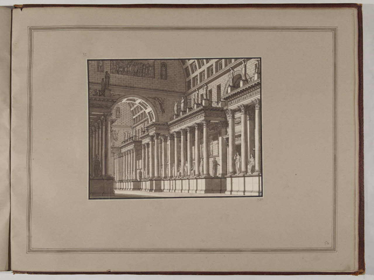 - NOTIZIE STORICO CRITICHE Il disegno fa parte di un album Vallardi del 1840, di dimensioni mm 561 x 735, sulla cui copertina in pelle marrone è incisa l'iscrizione in lettere capitali dorate "Paolo Landriani / milanese / e suoi contemporanei / nell'arte prospettica valentissimi. / Questi loro disegni / Giuseppe Vallardi / raccolse / per tramandare / co' passati maestri a' futuri / la stabile rinomanza / della scuola lombarda / l'anno MDCCCXL.". Ogni singolo disegno è incollato a un foglio dell'album, di carta grigia, presentante una cornice realizzata a penna e pennello e inchiostro sui toni del grigio.\nL'opera presenta analogie con altre, attribuite a Paolo Landriani, conservate negli album Vallardi.