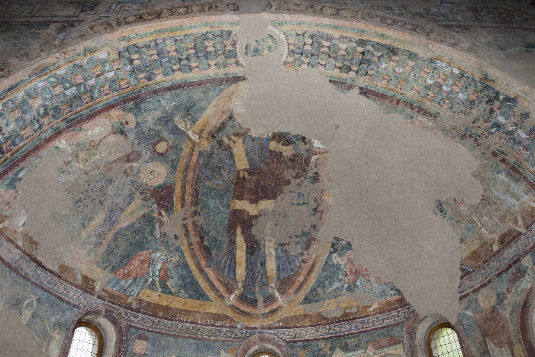 Al centro del semicatino absidale compare una scena di "Maiestas Domini": entro una mandorla policroma campeggia la figura frontale e stante di Cristo, in vesti imperiali, con il braccio destro in atto allocutorio e recante e nella mano sinistra un libro aperto. Verso di lui convergono, con dimensioni ridotte e prostrati, i Profeti Geremia ed Ezechiele, dietro ai quali sono identificabili gli Arcangeli Gabriele e Michele posti, ciascuno, a capo di un gruppo di Santi martiri offerenti croci e corone, sebbene la porzione destra dell'affresco risulti quasi del tutto mancante, così come il volto del Salvatore e gran parte del libro, dettagli tutti osservabili grazie ad acquarelli ottocenteschi.