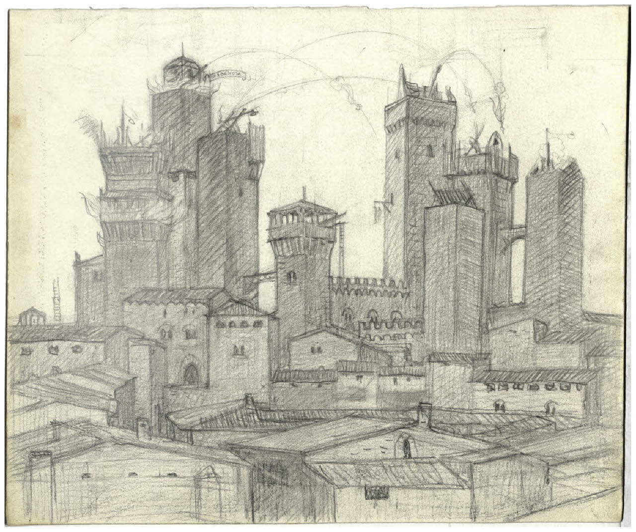 Torri di San Gimignano con macchine belliche. Disegno preparatorio per l'acquaforte Il Pianeta Venere