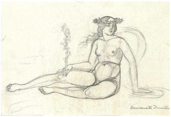 - NOTIZIE STORICO CRITICHE Questo disegno afferisce alla genesi dell'acquaforte Il Pianeta Venere (Bellini-Alberti 45). L'incisione è datata in lastra 1924 e in quell'anno fu esposta alla Biennale di Venezia. Le diverse fasi di elaborazione sono attestate da almeno un'ottantina di fogli nel Fondo Disertori del Gabinetto dei Disegni del Castello Sforzesco. Se si presta fede a quanto riferito dall'artista in un profilo autobiografico pubblicato da Riccardo Maroni nel 1954 (p. 28) la prima idea per una serie dedicata ai sette pianeti, a partire da Venere, risalirebbe al periodo in cui si trovava a Firenze (dove si era trasferito nel 1923). Questa cronologia sembrerebbe confermata da una nota manoscritta, "Firenze 1923" presente su almeno tre disegni, oggi conservati al Mart (inv. 2117, 2780, 2779; cat. Bellini-Alberti, fig. 45/a, 45/c e 45/d a p. 61). Non si spiega pertanto la data MDMXXI presente su inv. FD D 453. Difficile dire se tutti i disegni di nudo femminile che si propone qui di leggere in relazione con la preparazione dell'acquaforte risalgano proprio a questo momento, oppure se alcuni fossero precedenti. La veduta in basso è ispirata a San Gimignano, animata da una quantità di macchine belliche in molti casi ispirate al De re militari di Valturio. Nel cielo, entro una mandorla di luce Venere è assisa con in mano lo scettro, circondata dai segni zodiacali del Toro (sua casa principale), della Bilancia (casa secondaria) e infine di Cupido, che Disertori ha tratto da un bulino di Cristofano Robetta.