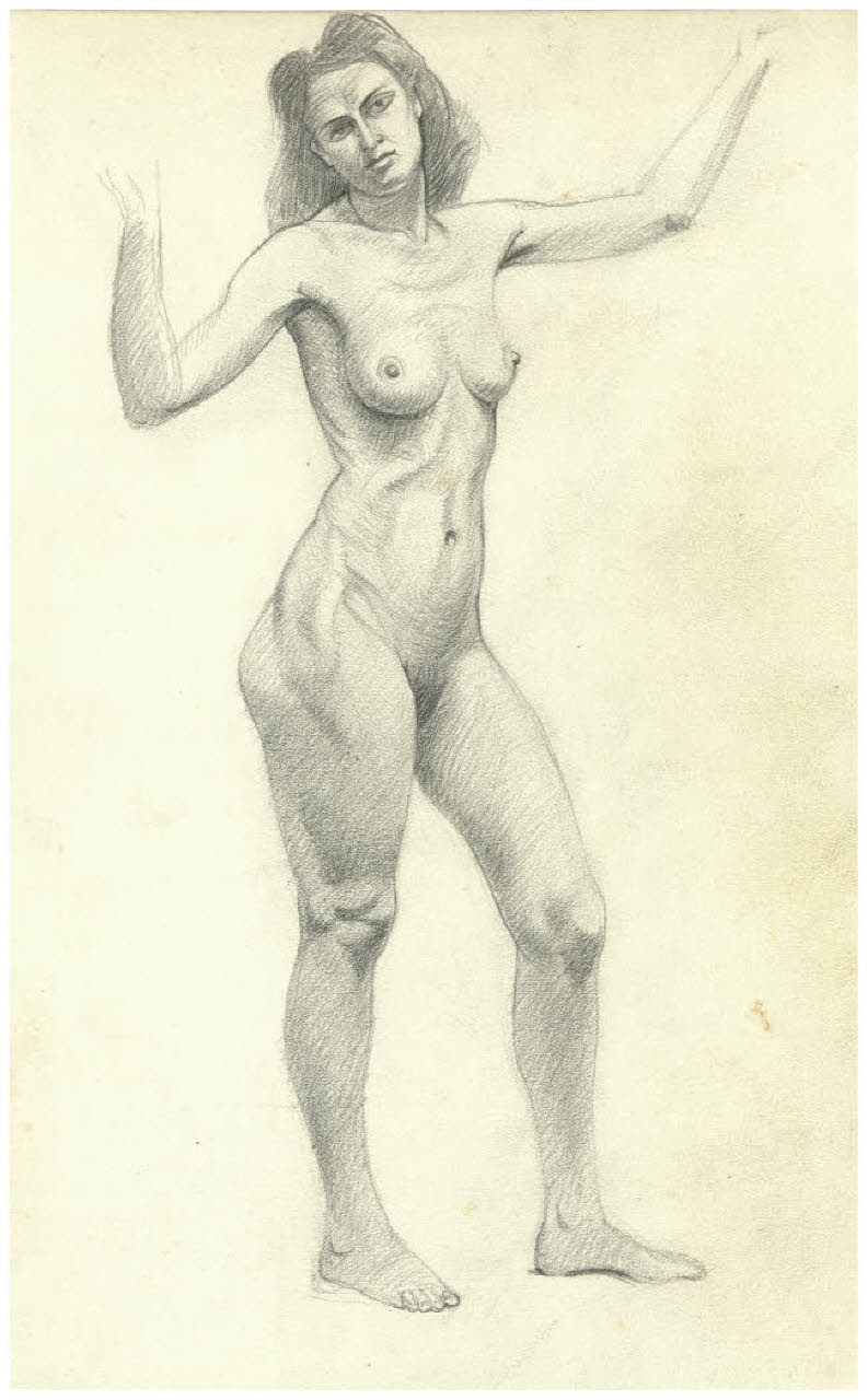 Nudo femminile in piedi con le braccia alzate