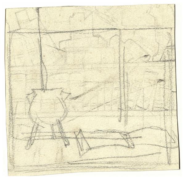 Libro aperto e vaso davanti a una libreria. Studio per ex libris (?)