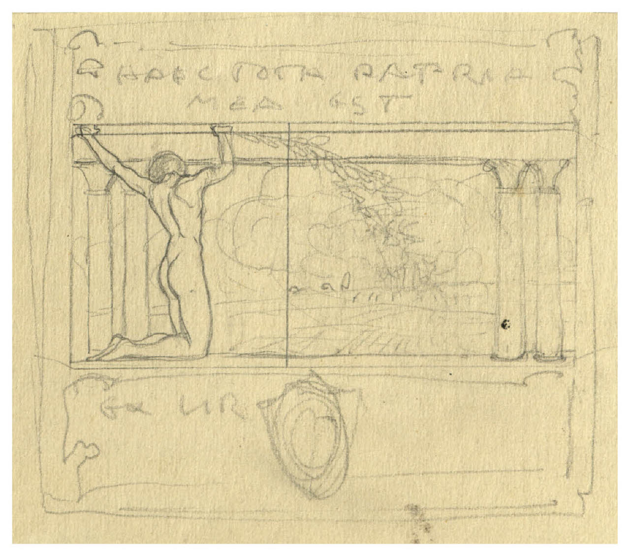 Nudo femminile in ginocchio e paesaggio - Haec tota est patria mea. Studio per ex libris