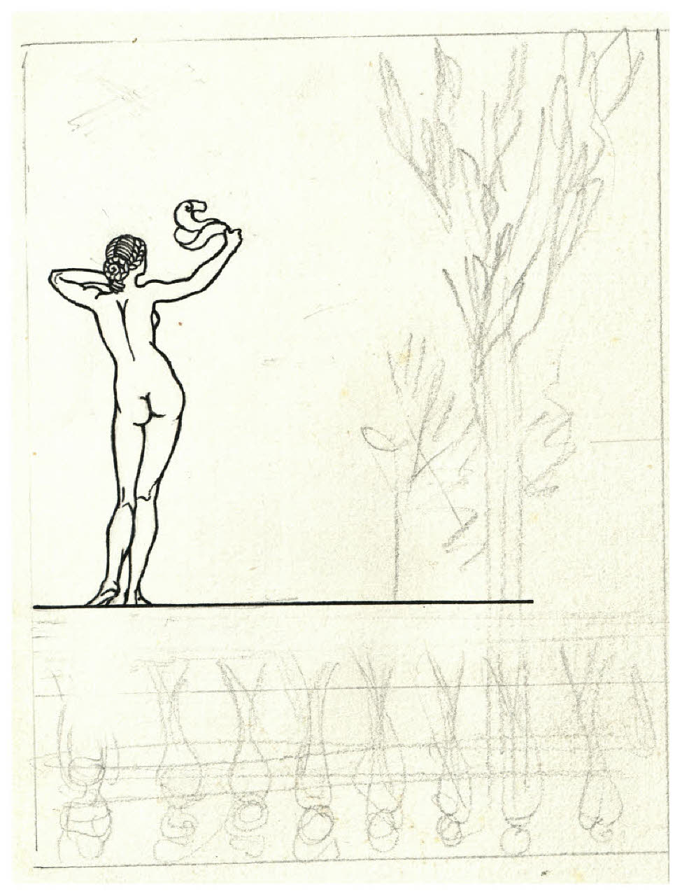 - NOTIZIE STORICO CRITICHE Il soggetto di questo disegna presenta una somiglianza con quello dell'acquaforte La ninfetta, 1913 (Bellini-Alberti 17). Potrebbe trattarsi di una prima idea per quel progetto.\n