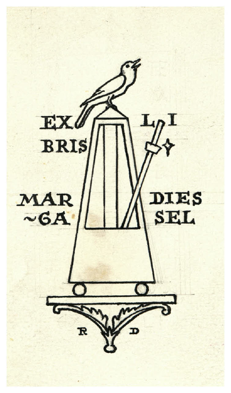 - NOTIZIE STORICO CRITICHE Disegno preparatorio per l'ex libris per Marga Diessel (Bellini-Alberti 150), realizzato con tecnica tipografica. Il monogramma in basso porta le iniziali di Regina Disertori.\n