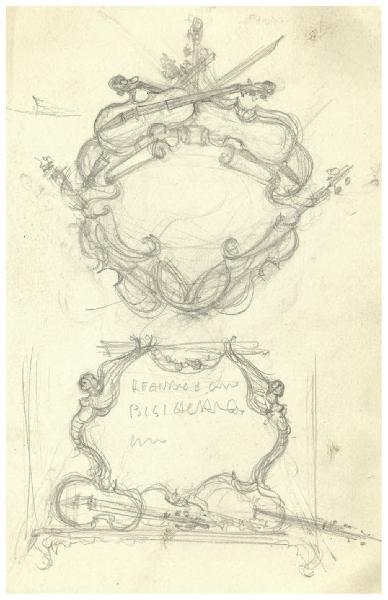 Doppio studio di targa con sirene e strumenti musicali nella cornice. Studio di ex libris per Leandro Biasiach?