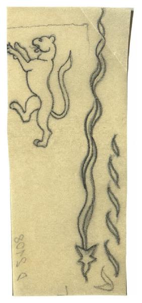 Felino rampante; Motivo decorativo. Disegno preparatorio per la sovraccoperta di Giovanni Pascoli, Prose, Milano, Mondadori, 1952