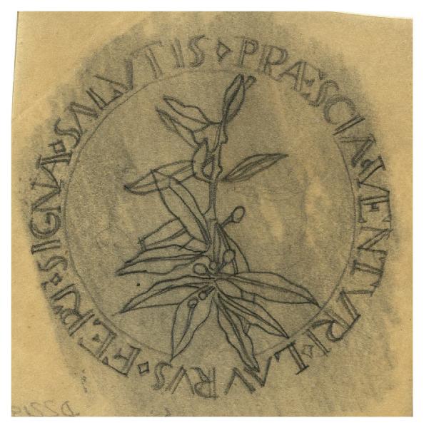 - NOTIZIE STORICO CRITICHE Disertori ha collaborato con la rivista Emporium dal 1920 al 1929 realizzando le copertine di otto numeri. Per il numero 338 (febbraio 1923) l'artista ha fornito per la copertina la xilografia Tranquillità (Bellini-Alberti 77), e per la IV di copertina un'impresa di formato circolare con un ramo di alloro con il motto "Praescia venturi laurus fert signa salutis", cavato dagli emblemi dell'Alciato (n. 211). Come sempre per i ricalchi su carta da lucido del Fondo Disertori del Gabinetto dei Disegni del Castello Sforzesco non è facile comprendere la funzione e la relazione rispetto ad altri disegni con lo stesso soggetto, per cui si propone una datazione al 1923 circa, che è l'anno in cui l'emblema risulta pubblicato per la prima volta.
