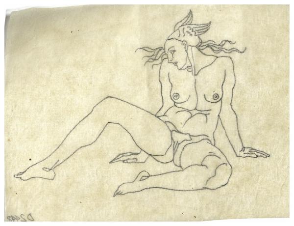- NOTIZIE STORICO CRITICHE Questo disegno afferisce alla genesi dell'acquaforte Il Pianeta Venere (Bellini-Alberti 45). L'incisione è datata in lastra 1924 e in quell'anno fu esposta alla Biennale di Venezia. Le diverse fasi di elaborazione sono attestate da almeno un'ottantina di fogli nel Fondo Disertori del Gabinetto dei Disegni del Castello Sforzesco. Se si presta fede a quanto riferito dall'artista in un profilo autobiografico pubblicato da Riccardo Maroni nel 1954 (p. 28) la prima idea per una serie dedicata ai sette pianeti, a partire da Venere, risalirebbe al periodo in cui si trovava a Firenze (dove si era trasferito nel 1923). Questa cronologia sembrerebbe confermata da una nota manoscritta, "Firenze 1923" presente su almeno tre disegni, oggi conservati al Mart (inv. 2117, 2780, 2779; cat. Bellini-Alberti, fig. 45/a, 45/c e 45/d a p. 61). Non si spiega pertanto la data MDMXXI presente su inv. FD D 453. Difficile dire se tutti i disegni di nudo femminile che si propone qui di leggere in relazione con la preparazione dell'acquaforte risalgano proprio a questo momento, oppure se alcuni fossero precedenti. La veduta in basso è ispirata a San Gimignano, animata da una quantità di macchine belliche in molti casi ispirate al De re militari di Valturio. Nel cielo, entro una mandorla di luce Venere è assisa con in mano lo scettro, circondata dai segni zodiacali del Toro (sua casa principale), della Bilancia (casa secondaria) e infine di Cupido, che Disertori ha tratto da un bulino di Cristofano Robetta.
