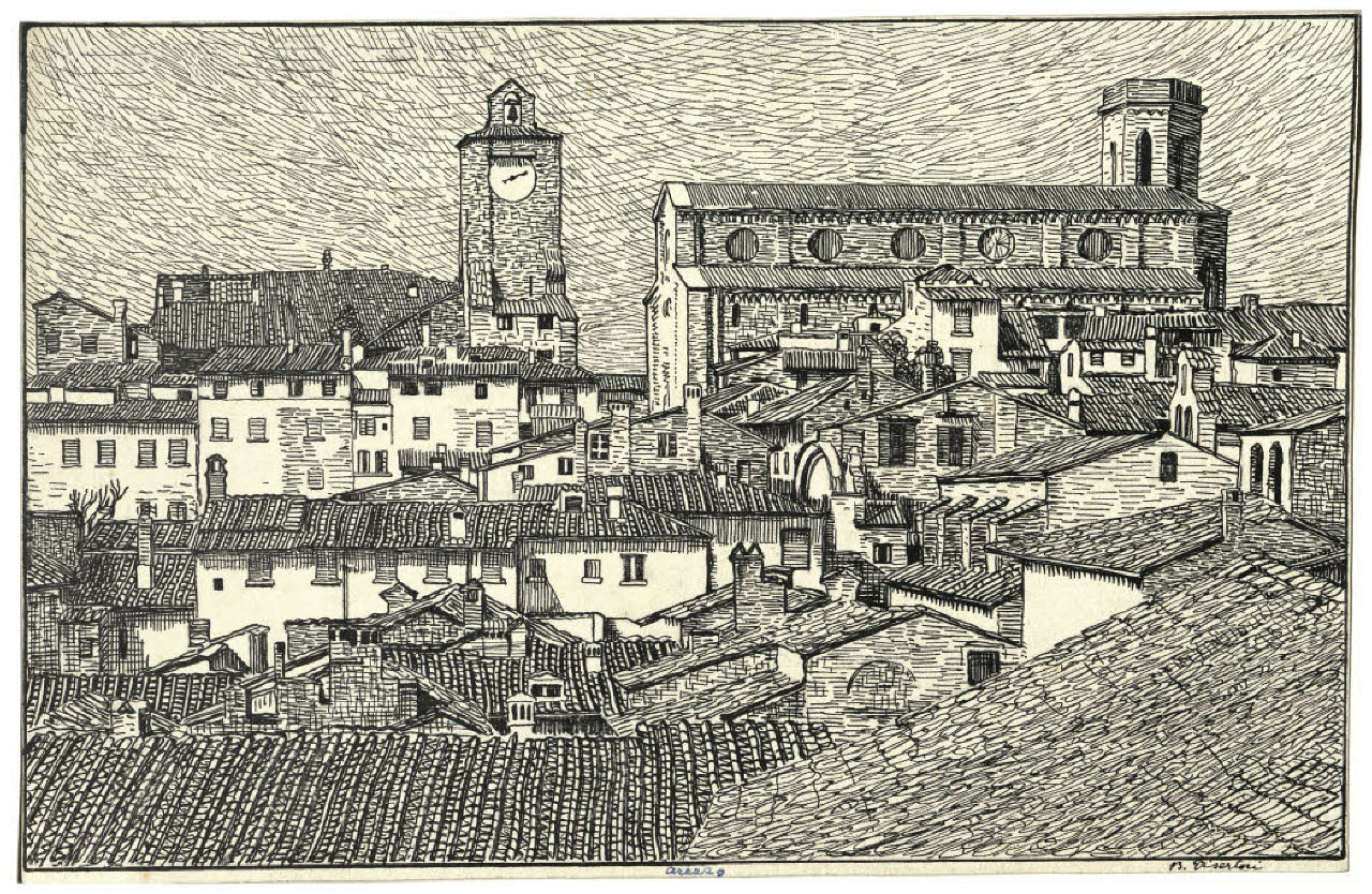 - NOTIZIE STORICO CRITICHE Il soggetto di questo disegno coincide parzialmente con l'immagine fissata da Disertori nell'acquaforte Arezzo. La torre civica (Bellini-Alberti 18).\n