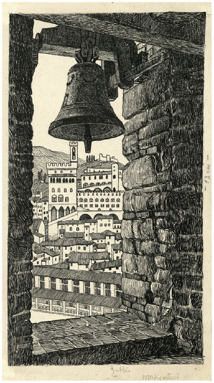 - NOTIZIE STORICO CRITICHE Disegno preparatorio per l'acquaforte Campanile di S. Francesco a Gubbio (Bellini-Alberti 9). Maggiori dettagli circa l'elaborazione di questo soggetto provengono ora da una nota manoscritta dell'artista ("XI. Campanile di S. Francesco a Gubbio 1911-1913") presente su un Album del Fondo Disertori al Gabinetto dei Disegni, che contiene una lista dei suoi lavori fino al 1917 circa (FD Album 10, 6). \n