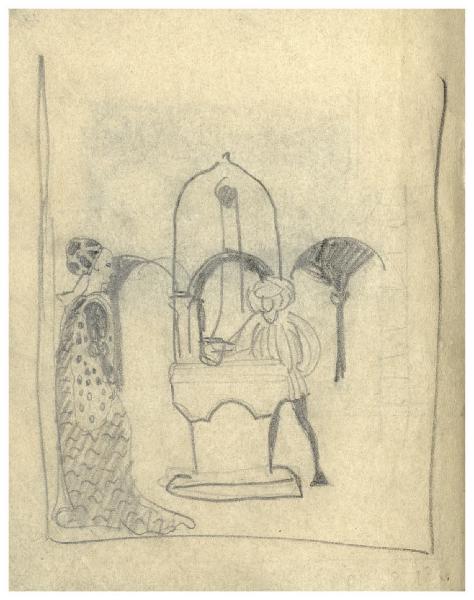- NOTIZIE STORICO CRITICHE L'album nel quale è contenuto questo disegno è riconducibile, con poche eccezioni, al progetto per l'illustrazione, in xilografia, della Giornata IX del Decamerone di Boccaccio per l'edizione Formiggini del 1916 (collana "I Classici del Ridere"). La sua datazione è riferibile pertanto al 1913-14, quando Disertori avrebbe iniziato a studiare per queste incisioni. Alle carte 2 recto e 2 verso è vergata una lunga annotazione autobiografica dell'artista (forse successiva ai disegni), che ricorda le difficoltà economiche conosciute "in questi anni dal 1914 in poi".