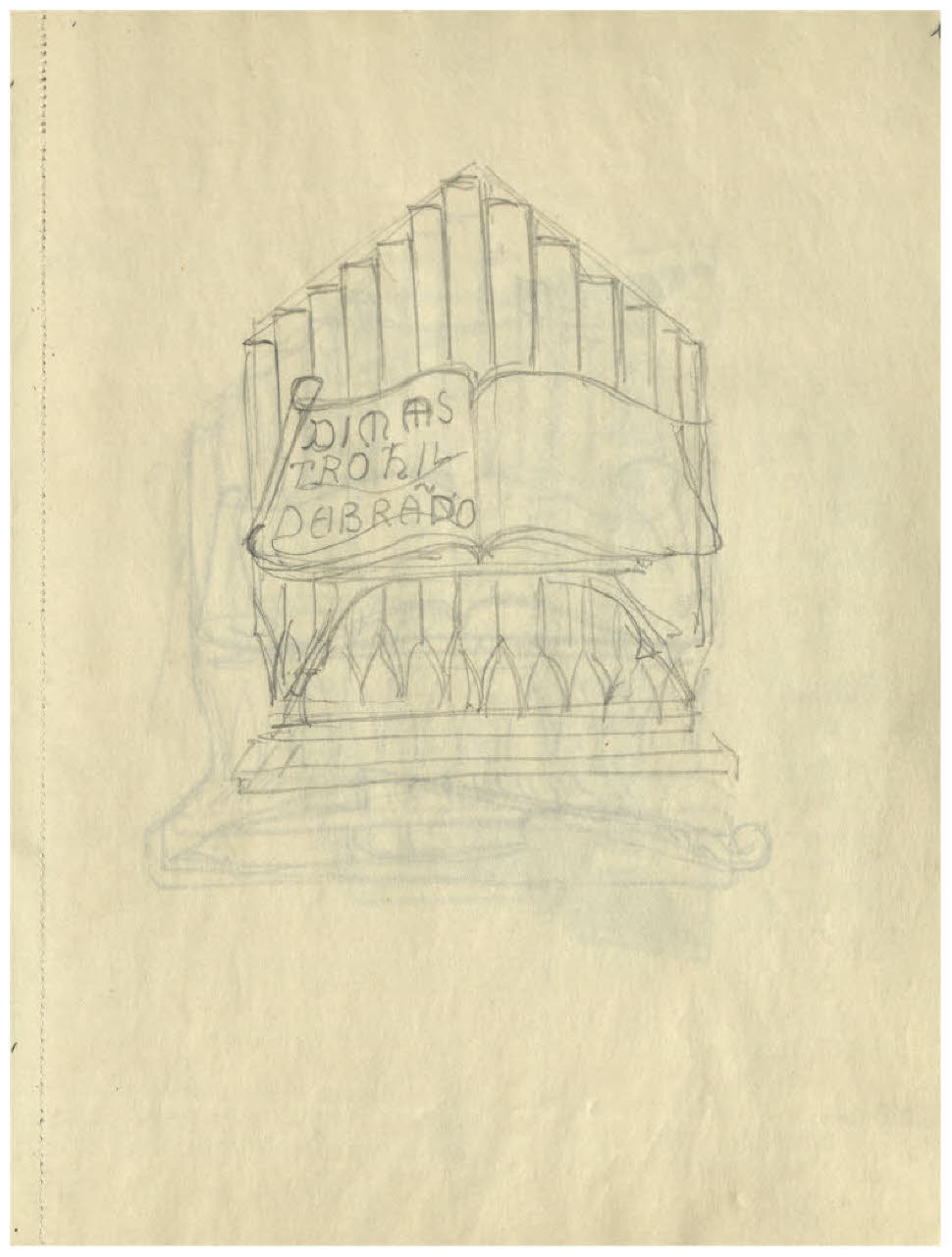 Spartito aperto e canne d'organo - Di maestro Hildebrando [...]. Disegno preparatorio per il frontespizio di Ildebrando Pizzetti, La leggenda di Santo Basilio, 1912
