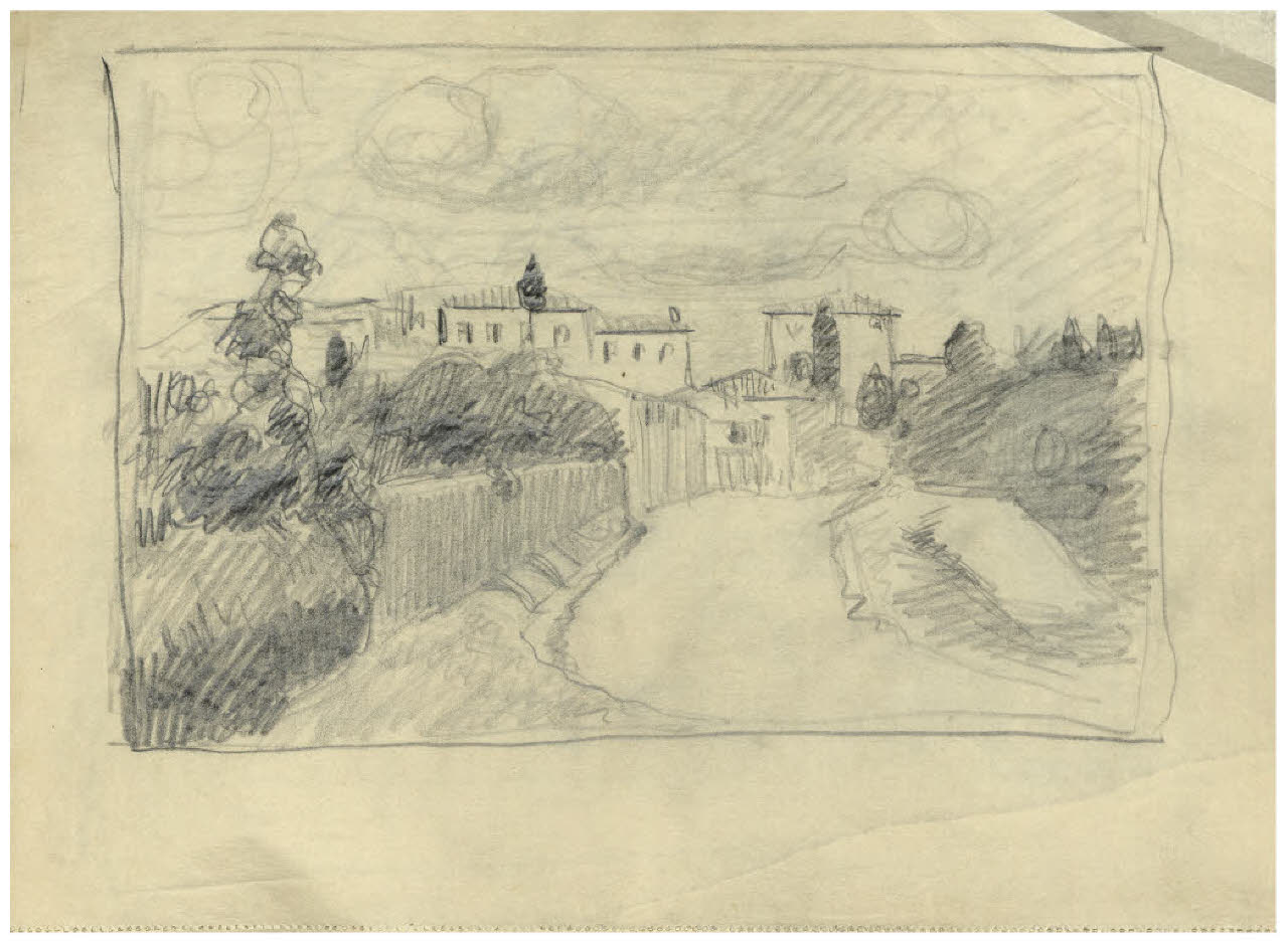 - NOTIZIE STORICO CRITICHE L'album del quale fa parte il disegno qui schedato può datarsi alla prima metà degli anni Dieci, dopo il rientro in Italia nel 1911, quando Disertori intraprende una serie di viaggi e conosce le città medioevali del centro Italia. Vi si riconoscono infatti vedute di San Gimignano e Perugia. Sono inoltre presenti disegni destinati a progetti editoriali come il Decameron per le edizioni Formiggini (edito nel 1916, ma in preparazione dal 1913-14), la Leggenda di San Basilio di Ildebrando Pizzetti (1912), e Frammenti vissuti di Torello Fanciullacci per la Tipografia emiliana a Venezia (1913).