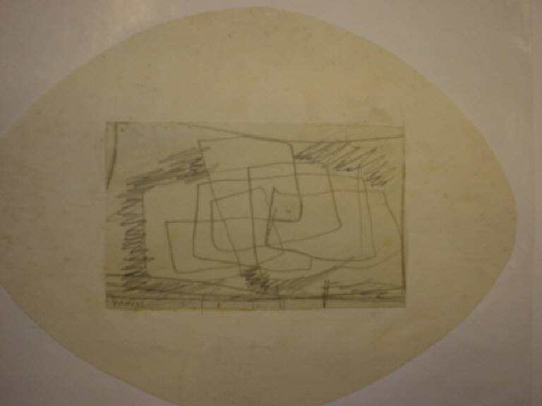 All'interno di un ovale è stato collocato un rettangolo entro il quale una linea irregolare e continua forma delle figure geometriche.