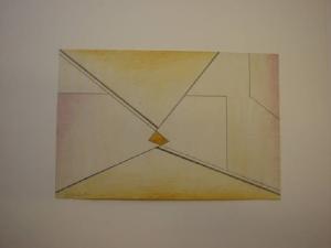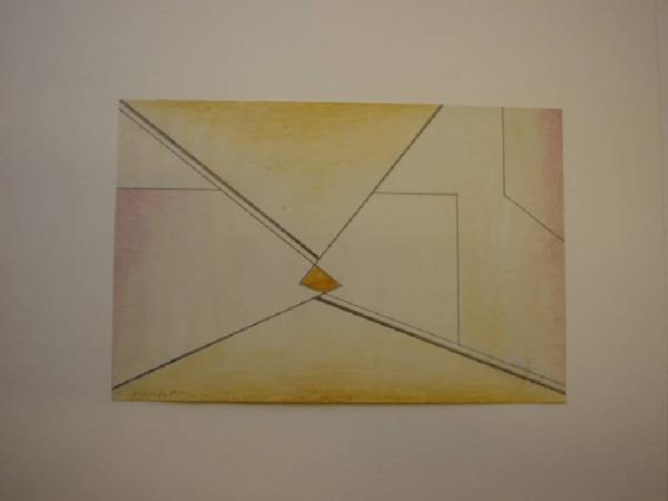 Composizione astratta formata dall'intersecazione di 3 figure poligonali irregolari (due triangolari e una rettangolare). I moduli geometrici, definiti da segni scuri, sono colorati all'interno con tinte tenui e sfumate (sul giallo-arancio e rosso-violetto