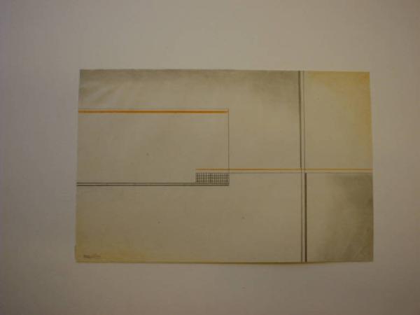 Il disegno è caratterizzato da linee che intersecandosi vengono a formare al centro una griglia. Nella tessitura geometrico-lineare si inseriscono sfumature ottenute con pastelli e grafite. Sulla generale impostazione monocroma risaltano due linee arancioni