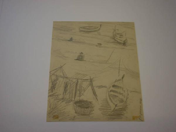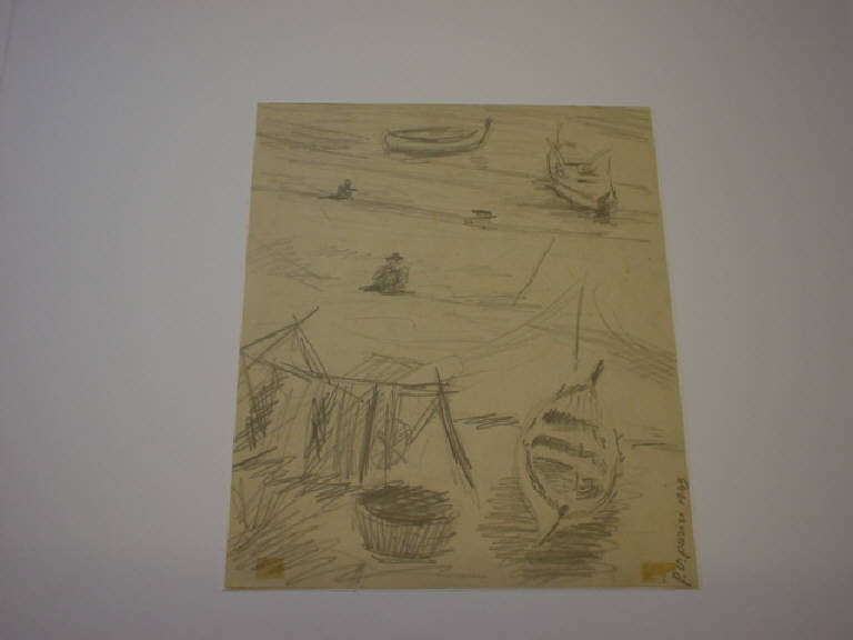 Con tratti rapidi e sommari è suggerito un paesaggio marino, disponendo in basso una barca di legno e una cesta da pesca e in alto tre figure di pescatori accovacciati e due imbarcazioni in acqua.