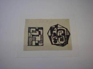 Due figure geometriche, una sotto l'altra e simmetriche al centro, occupano in altezza l'intero spazio rettangolare. La figura in alto è pseudo-ottogonale e presenta all'interno una decorazione mistilinea a zone bianche o nere; la figura più in basso è rettangolare