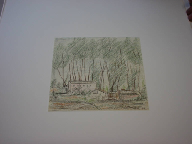 Con colori tenui e delicati è raffigurato un gruppo di case immerse in una macchia di alberi. L'altezza degli alberi è sproporzionata rispetto allo spessore dei loro tronchi, non verisimile. La definizione degli elementi è affidata ad un tratteggio veloce