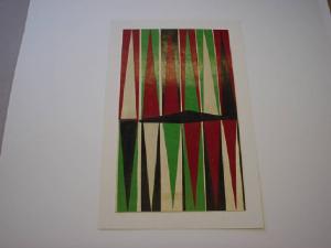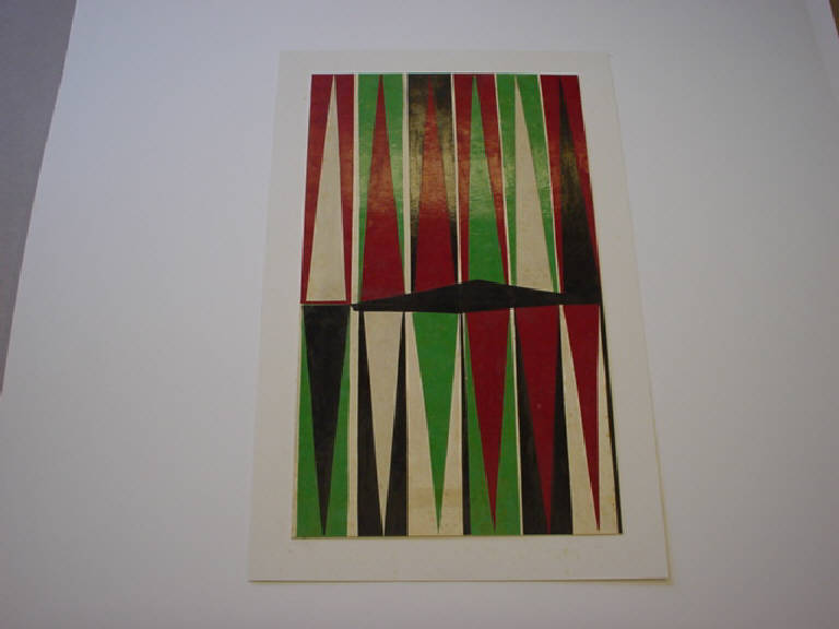 All'interno di due serie di sei rettangoli allungati e posti uno di fianco all'altro, sono inscritti triangoli allungati di colore verde, rosso e nero. Le due serie sono poste una sopra l'altra, e separate in senso orizzontale da un parallelogrammo irregolare