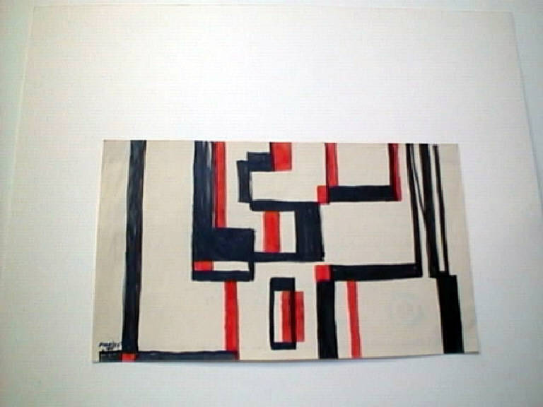 Su un piano bidimensionale bianco avorio si inscrivono forme geometriche, ad andamento prevalentemente verticale, realizzate ad inchiostro nero e rosso. Tali moduli, per la massima parte, sono collegati tra loro.