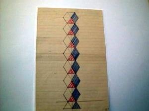 L¿opera raffigura il progetto per un modulo tridimensionale verticale, il cui elemento di base è l¿esagono. I colori usati sono il nero, il rosso e il blu.