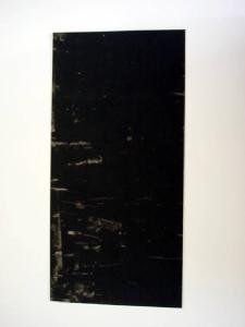 Con l'uso del pennello giapponese e della lamina metallica, il pittore sperimenta gli esiti espressivi del colore nero, qui steso in una campitura compatta