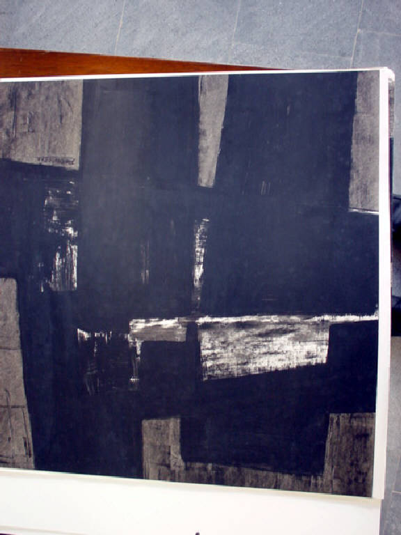 Con l'uso della tempera diversamente diluita, il pittore ha steso quattro larghe campiture di colore, a fasce trapezoidali, incrociate due a due