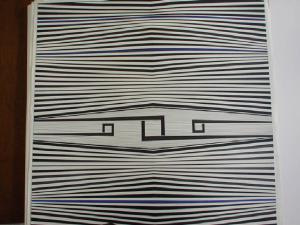 Su di un fondo color bianco si dispongono linee di diverso spessore in color nero che, perfettamente verticali alle due estremità, tendono ad assumere un leggero andamento obliquo convergente verso il centro, formando un modulo pseudo poligonale