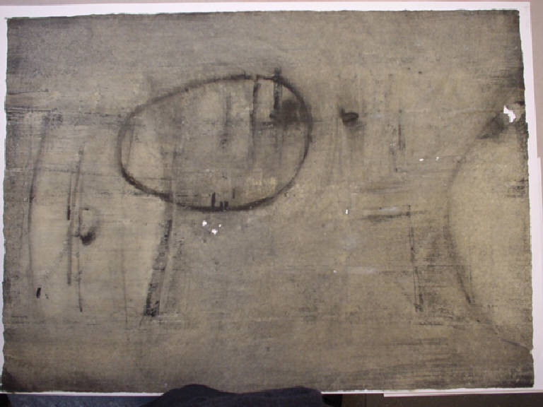 Il particolare trattamento del supporto, raschiato e trattato con l'acquerello di colore grigio rende questa opera molto singolare. La presenza di segni taglienti e di un ovale valorizza ancora meglio i valori tattili e materici di questo disegno.