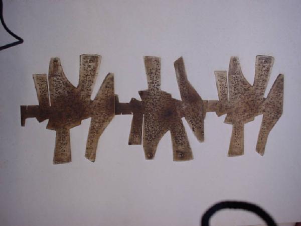 Una sagoma biomorfa è ripetuta in sequenza orizzontale, e presenta al suo interno un fitto puntinato irregolare.