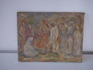 E' raffigurato in forme evanescenti un mercato, ma l'immagine è delineata non per identificazione figurativa ma per accostamento e giustapposizione di macchie di colore che ne consentono la lettura globale. Vi è una prevalenza di colori vivaci (verdi, blu, rossi arancio, viola con pennellate grasse di bianco)