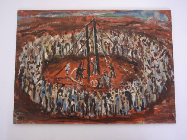 Una vasta folla assiste in cerchio ad una rappresentazione circense. La prospettiva è a volo d'uccello. L'immagine per quanto realistica è strutturata in maniera tale che lo spettatore dia maggiore valore alla sua componente formale che non a quella aneddotica. I colori utilizzati sono molto vivaci - sul rosso dello sfondo si staccano gli azzurri, i gialli e i neri della folla.