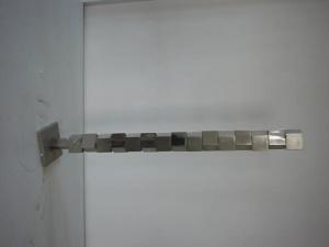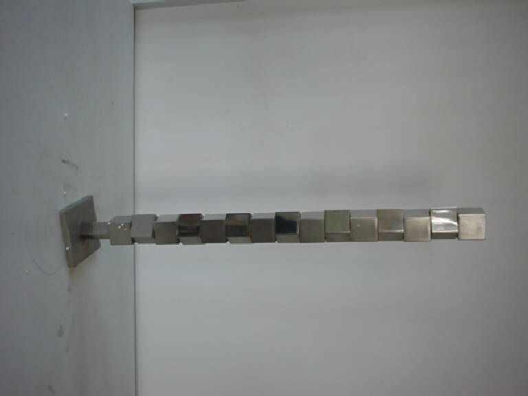 Su una base quadrangolare si eleva, con forte sviluppo verticale, una serie di quindici elementi cubici in acciaio alternativamente satinato e lucido, assemblati secondo il principio della sezione aurea, tra loro e rispetto alla base, cioè in un rapporto di dissimmetria dinamica