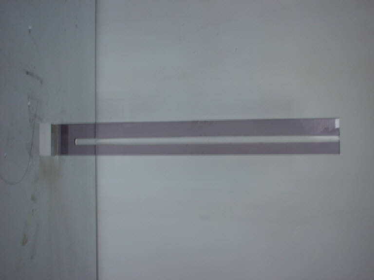 In un modulo rettangolare ad accentuato andamento verticale in polimetacrilato è inserito in dissimmetria dinamica un elemento tubolare trasparente. Il modulo si iscrive in una base quadrangolare trasparente