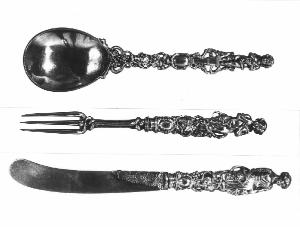 - NOTIZIE STORICO CRITICHE Come attestano i punzoni, il coltello, facente parte di un servizio da dessert per una persona, venne realizzata a Londra nel 1855 dall'argentiere londinese F. Higgins, attivo con il proprio marchio dal 1818 al 1868, ritenuto uno dei migliori fabbricanti di caddy spoons di epoca vittoriana ma assai apprezzato anche per la produzione di posate, oggetti eleganti e di raffinata lavorazione, spesso ispirati, nella decorazione, come questi pregevoli esemplari, dalle forme della natura, rese con attenta sensibilità descrittiva. Insieme all'omonimo primogenito, F. Higgins diede vita dal 1868 al rinomato marchio Francis Higgins & Son, divenuto poi Francis Higgins & Son Ltd nel 1909. La manifattura cessò l'attività all'avvento della seconda guerra mondiale. Assai frequente nella posateria inglese ottocentesca il motivo decorativo dei tralci d'uva, qui arricchito dalla presenza delle figure ai terminali. Le posate sono conservate nell'astuccio originale.