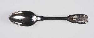 Cucchiaino con coppa ovale e manico a violino, riccamente inciso con medaglione a ornamentazione geometrica circondato da volute e nastri intrecciati e centrato da iscrizione entro stemma
