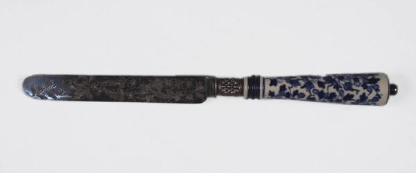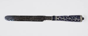 Serie di dodici coltelli: lama parallela a punta arrotondata incisa a decori floreali, manico a sezione circolare, rastremato, in ceramica dipinta a fiori blu e azzurri su fondo bianco, con collarino ad anello. Colletto cilindrico a losanghe. Piccolo terminale sferico