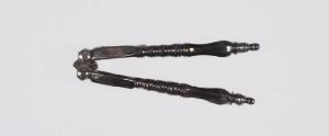Serie di due schiaccianoci: manici lisci con serie di anelli alternati a dischetti nella parte centrale, parte terminale a sezione esagonale sagomata a balaustro conclusa all'apice da motivo a pigna