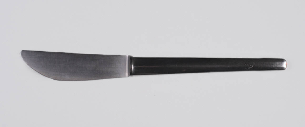 - NOTIZIE STORICO CRITICHE Il coltello fa parte del servizio, in acciaio, denominato "Metron", progettato da R. Sambonet nel 1960 per la Sambonet S.p.a. . La sua forma si caratterizza per l'eliminazione delle citazioni dall'antico e per la concentrazione del progettista su forme diverse e in contrasto come il manico appiattito e lungo e la lama corta . Il "rinforzo" a spina al collo del manico è spiegato dallo stesso R. Sambonet come "una piega strutturale di origine quasi organica che ho progettato studiando le strutture in botanica e che più tardi ho ritrovato in posate del 1600, in modelli di epoca barocca e anche settecenteschi"